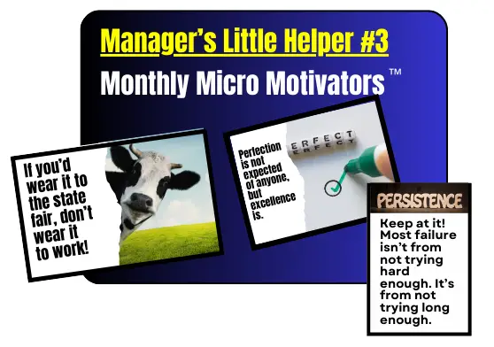 Inside, you’ll find three Manager’s Little Helpers™ to make your job a little less stressful and a lot more fun.